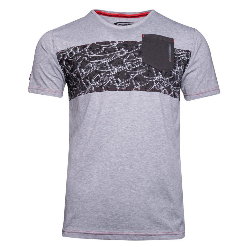 • T-shirt, szary • Nadruk „Performance”, czerwone szwy. • Kontrastowe czerwone szwy na rękawach i w pasie. • naszyta kieszonka na piersi w kolorze szarym z nadrukiem „performance” ton w ton • Pałąk na szyję w kolorze czerwonym „Performance”.