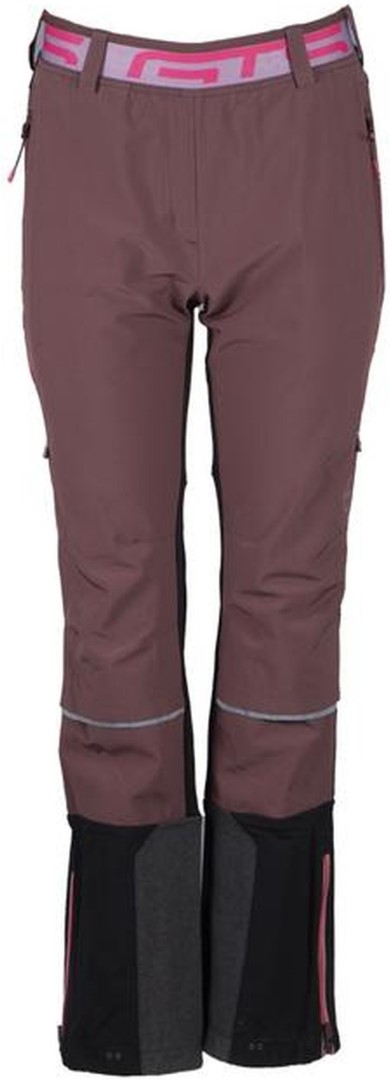 Spodnie damskie Mendola marki GTS. Wzmocnione po wewnętrznej stronie nogawek, wiatroszczelne z przodu, zapinane na zamek błyskawiczny u dołu nogawek oraz odblaskowe nadruki i wstawki.