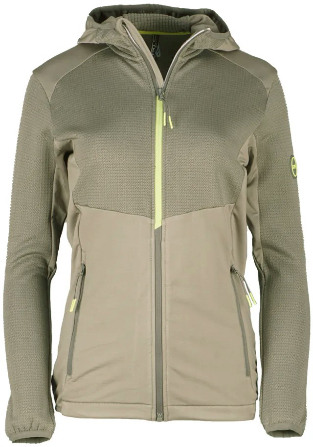 Damska bluza z kapturem zapinana na suwak, wykonana z lekkiego, funkcjonalnego, wygodnego i elastycznego materiału. Nadaje się do całorocznego noszenia. Dzianina o strukturze wafla tworzy kieszenie powietrzne w warstwie wierzchniej, co zwiększa właściwości termoizolacyjne.