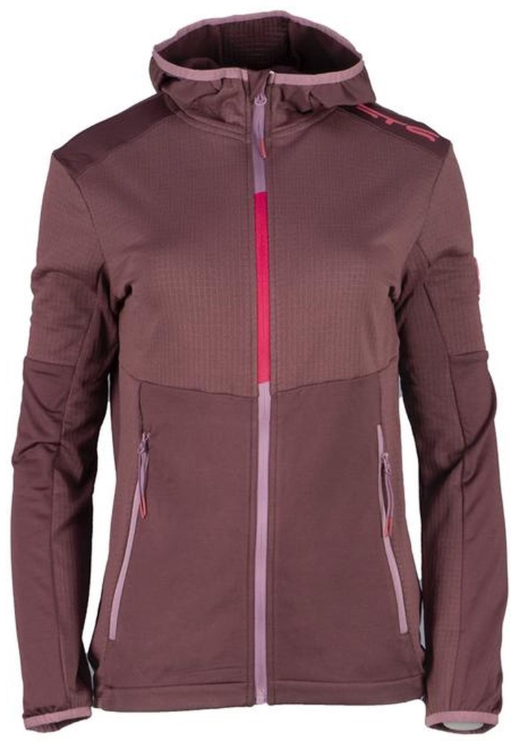 Damska bluza z kapturem zapinana na suwak, wykonana z lekkiego, funkcjonalnego, wygodnego i elastycznego materiału. Nadaje się do całorocznego noszenia. Dzianina o strukturze wafla tworzy kieszenie powietrzne w warstwie wierzchniej, co zwiększa właściwości termoizolacyjne.