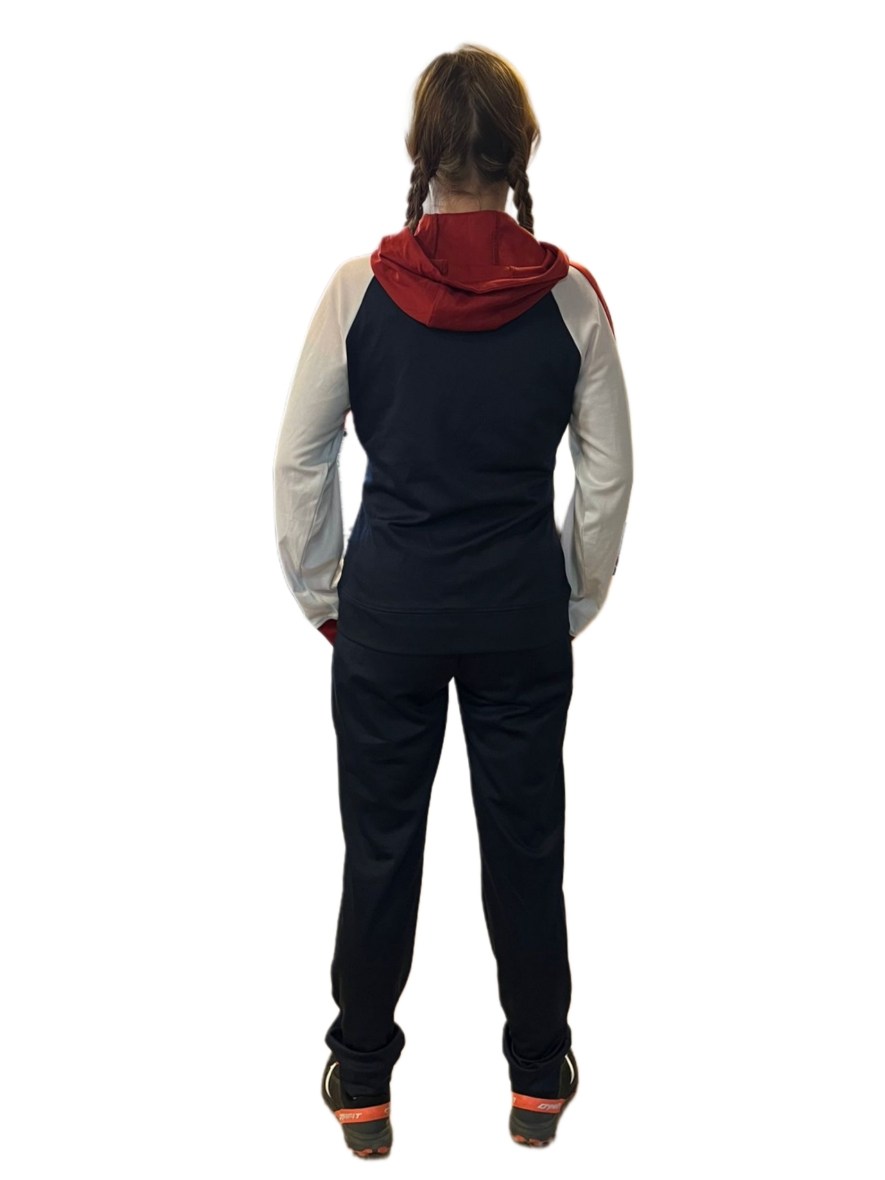 Trzykolorowa bluza z logo na piersi, spodnie z gumką i sznurkiem w pasie, kieszenie boczne w bluzie i spodniach